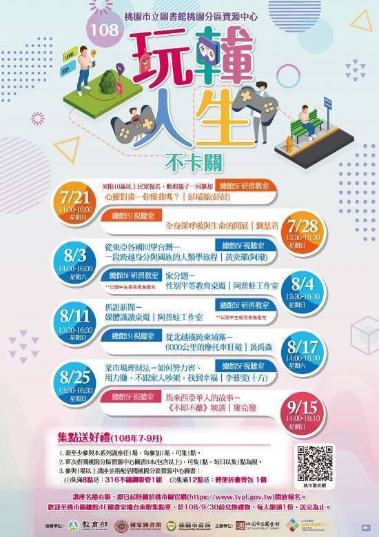 一、本系列講座完全免費,「家分題—性別平等教育桌遊」及「抓誑新聞—媒體識讀桌遊」這兩場活動,分別以國中生或高中生報名者為優先,本館將視實際報名狀況予以分組或開放一般民眾參加。 二、活動報名網址: https://is.gd/cESf5p ,請協助廣為宣傳並鼓勵同仁或學生踴躍參加。