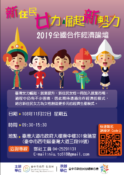 | 主旨: | 函轉臺中市政府委託社團法人臺中市新住民團體聯合會於本(108)年 11 月 22 日(五)辦理「2019 合作經濟論壇-新住民女力崛起新勢力」,請惠予協助宣傳,請查照。 |