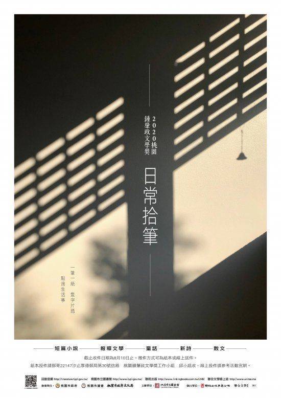 一、「2020 桃園鍾肇政文學獎」徵件自即日起至 109 年 8 月 10 日截止,徵件類別為短篇小說、報導文學、散文、童話及新詩等 5 類組,總獎金新臺幣 200 萬元。