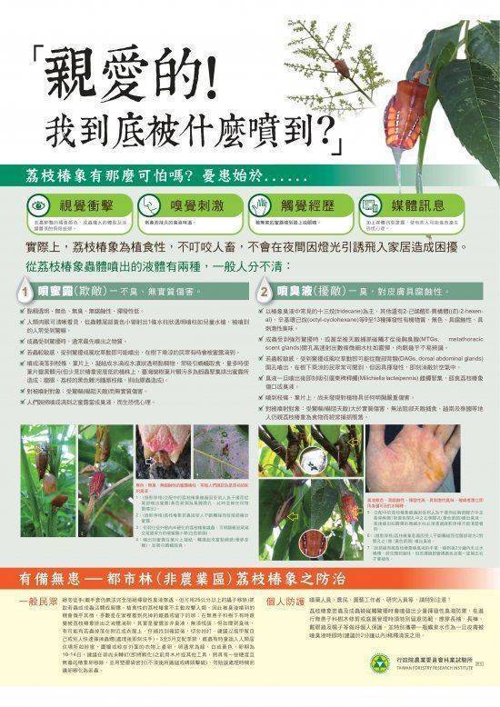二、非農業環境中荔枝椿象蟲源主要來自龍眼樹或臺灣欒樹,因該蟲受擾動時會噴出具腐蝕性臭液自我保護,如觸及人體皮膚或眼睛,可造成灼傷或失明危險,為避免該蟲危及學校師生與人員之安全,請貴校視所轄荔枝椿象疫情辦理防治與宣導作業。