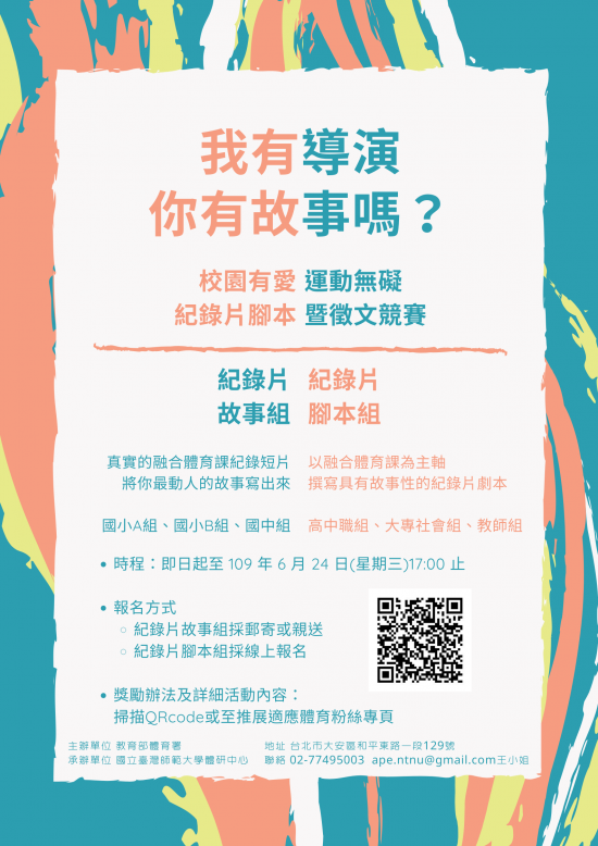 | 二、 | 旨揭競賽透過徵文及紀錄短片腳本方式,徵選適應體育相關故事,選擇適合之腳本由專業導演拍攝,宣導臺灣適應體育現況,並打破舊有身心障礙學生無需上體育課與體能性活動觀念,鼓勵身心障礙者為自身權益發聲。 |