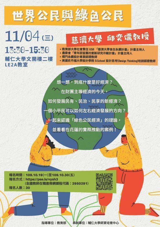 主旨:函轉輔仁大學學校財團法人輔仁大學師資培育中心舉辦「世界公民與綠色公民」專題演講一案,請查照。