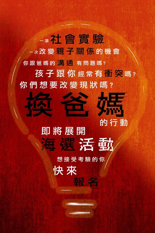| 二、 | 換爸媽這可能是一些孩子的心聲,尤其當親子關係發生緊張關係時,這樣的想法可能會逃竄出來,而爸媽也常常聽到小孩埋怨說別人的爸媽比較好,面對這樣的埋怨,爸媽也很無奈、甚至苦無量法改善,本節目欲進行一次大膽的社會實驗,將換爸媽的心聲轉換成實際行動---讓小朋友短暫離開家,去別人家當小孩,爸媽也暫時脫離跟孩子的緊張關係。我們誠摯邀約 10-18 歲的同學們參與『換爸媽』社會實驗的徵選活動。 |
