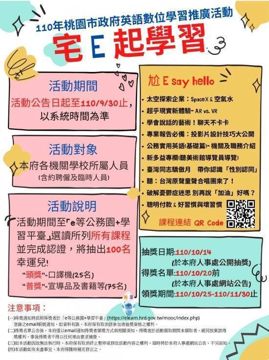 (四) | 抽獎方式: 110 年 10 月 14 日公開抽獎,得獎名單於同年 10 月 20 日公告在本府人事處網站,並請得獎者於同年 10 月 25 日至 11 月 30 日期間領取獎品。 |