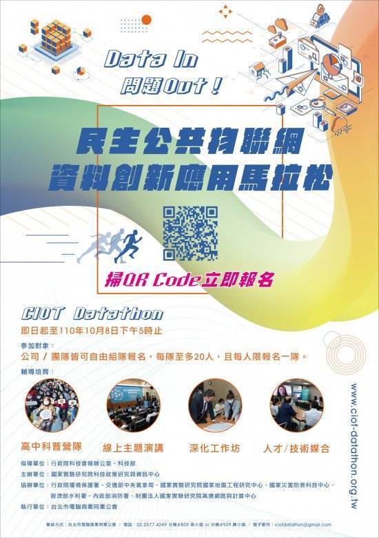 | 三、 | 本案為免費報名參加,報名時間由原訂 110 年 9 月 17 日(星期五)17 時止,展延至 110 年 10 月 8 日(星期五)17 時止,詳細報名資訊請見網址(https://www.ciot-datathon.org.tw/)。 |