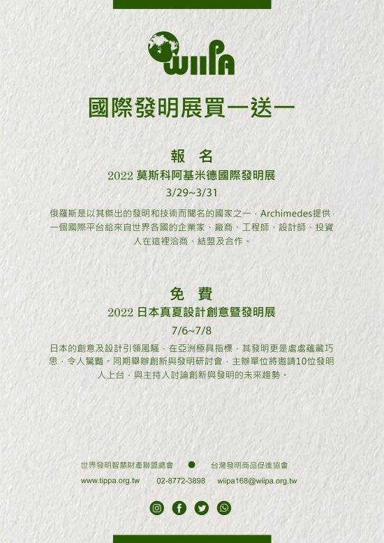 發明展補助專案。報名參加「2022莫斯科阿基米德國際發明展」之作品,可以申請