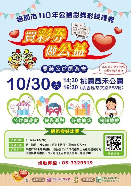 說明: 一、本次活動訂於 110 年 10 月 30 日(星期六)下午 2 時 30 分至 4 時 30 分,假桃園區風禾公園辦理,當天有園遊會、身心障礙體驗活動、精彩的舞台表演及有獎徵答,歡迎踴躍參加。 二、檢附活動單張,另宣傳海報將由財團法人桃園市私立寶貝潛能發展中心逕行寄送,請貴校協助張貼並廣為宣導。