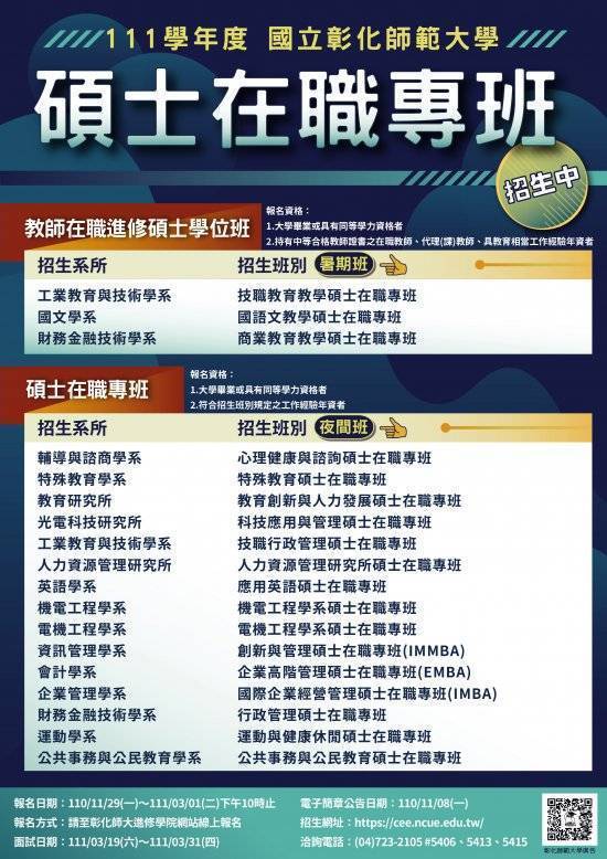 國立彰化師範大學碩士在職專班招生中,報名自即日起至111年3月1日下午10時止,