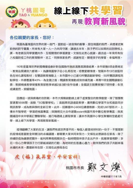 本市110學年度寒假「市長給全市高國中小學生家長的一封信」