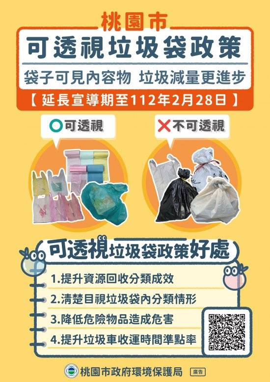 | 一、 | 本市近年人口增長快速,導致垃圾問題增加,故為減輕垃圾處理壓力,建立民眾垃圾資源分類良好習慣,減少清潔隊員檢查時間,清楚目視判斷垃圾袋內容物,降低危險物品夾雜危險,故本局推動可透視垃圾袋政策,並因應民眾反映意見,延長政策宣導期至 112 年 2 月 28 日 。 |