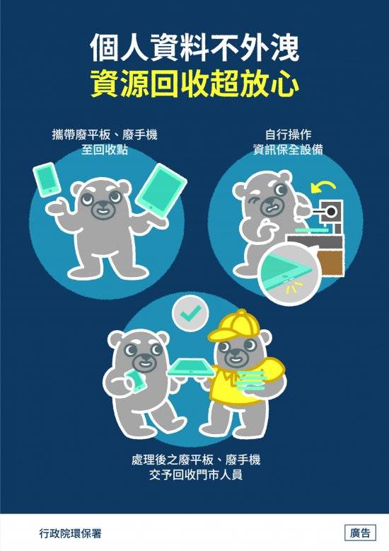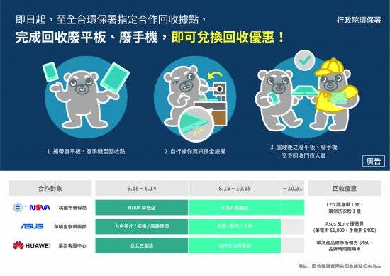 二、 | 行政院環境保護署為考量民眾對於資訊產品(如手機、平板電腦等)回收時容易衍生資料外洩之疑慮,故與本局及 NOVA 資訊廣場聯袂辦理旨揭活動,以提升資訊保全效益及現場回收換好禮。 |