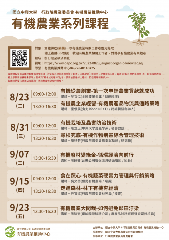 | (三) | 報名方式:統一網路報名,實體課程名額有限,額滿為止;線上同步不限額(報名網址: https://www.oapc.org.tw/2022-0823_august-organic-knowledge/)。 |